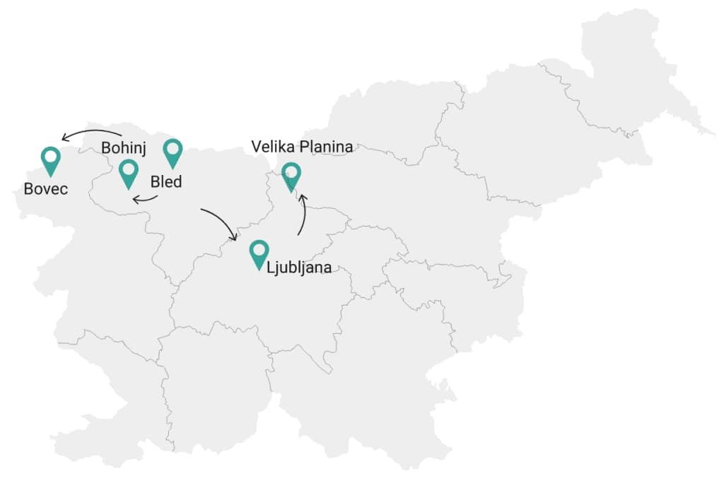 Om al de schoonheid van de Soča-vallei in je op te nemen, zullen we de Virje-waterval bezoeken, naar de bron van de Soča-rivier wandelen en verwonderen over de magische Šunik-waterboomgaard. Een schilderachtige rit over de Vršič-pas brengt ons naar de hoofdstad Ljubljana. Daar zullen we de beroemde architectuur verkennen met een fietstocht en de levendige sfeer van de stad voelen. Last but not least nemen we je mee terug in de tijd op de hoge weiden van Velika Planina, waar je door een uniek herdersdorp terug in de tijd wordt gebracht.